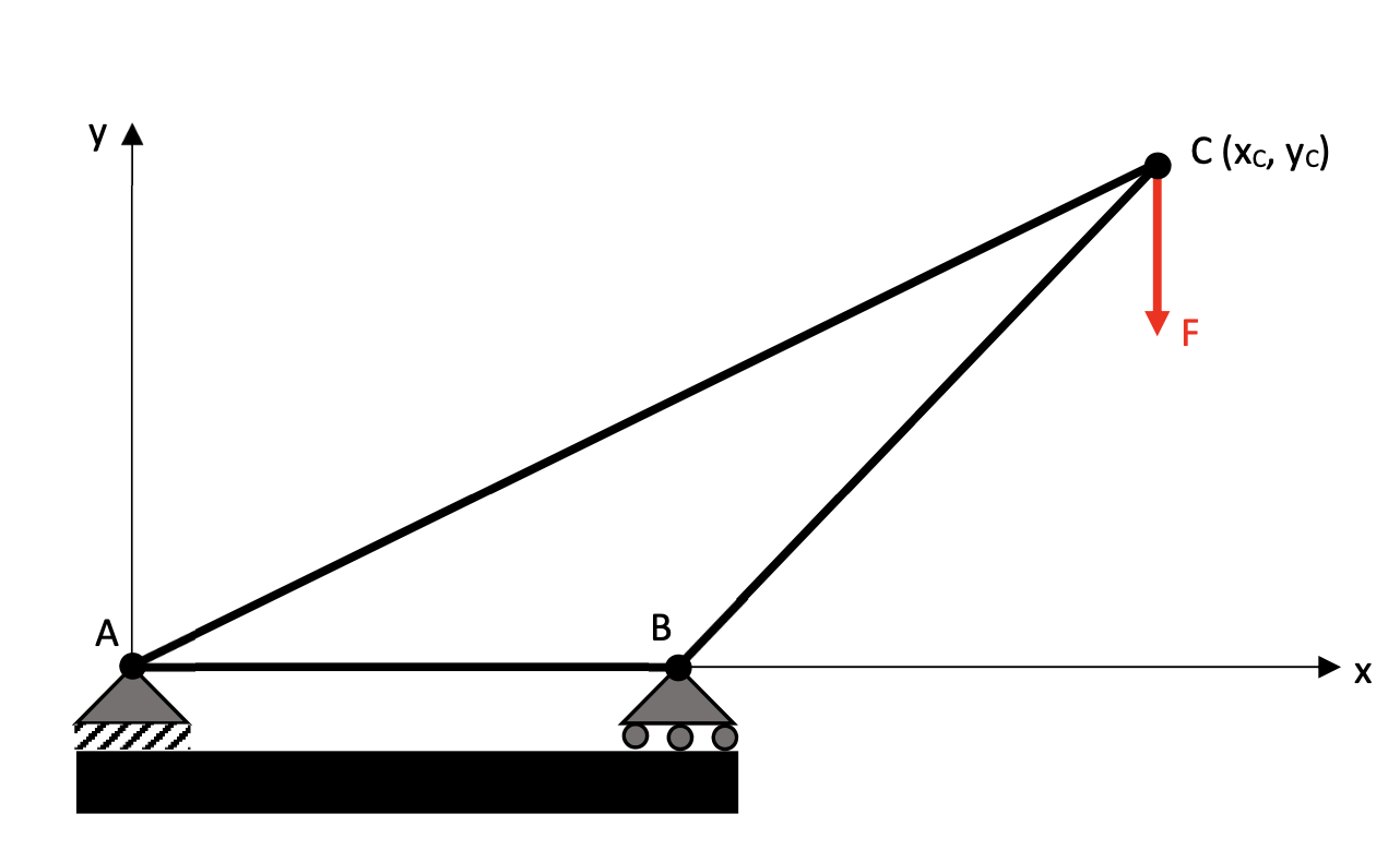 Node A is the origin of our coordinate system, node B is at (1, 0), and the location of node C is something we are trying to design. Be sure to use matrix form (this is just a small problem to keep things simple, which you could solve by hand without forming a matrix, but that won’t be true when we take on more realistic problems that are larger).