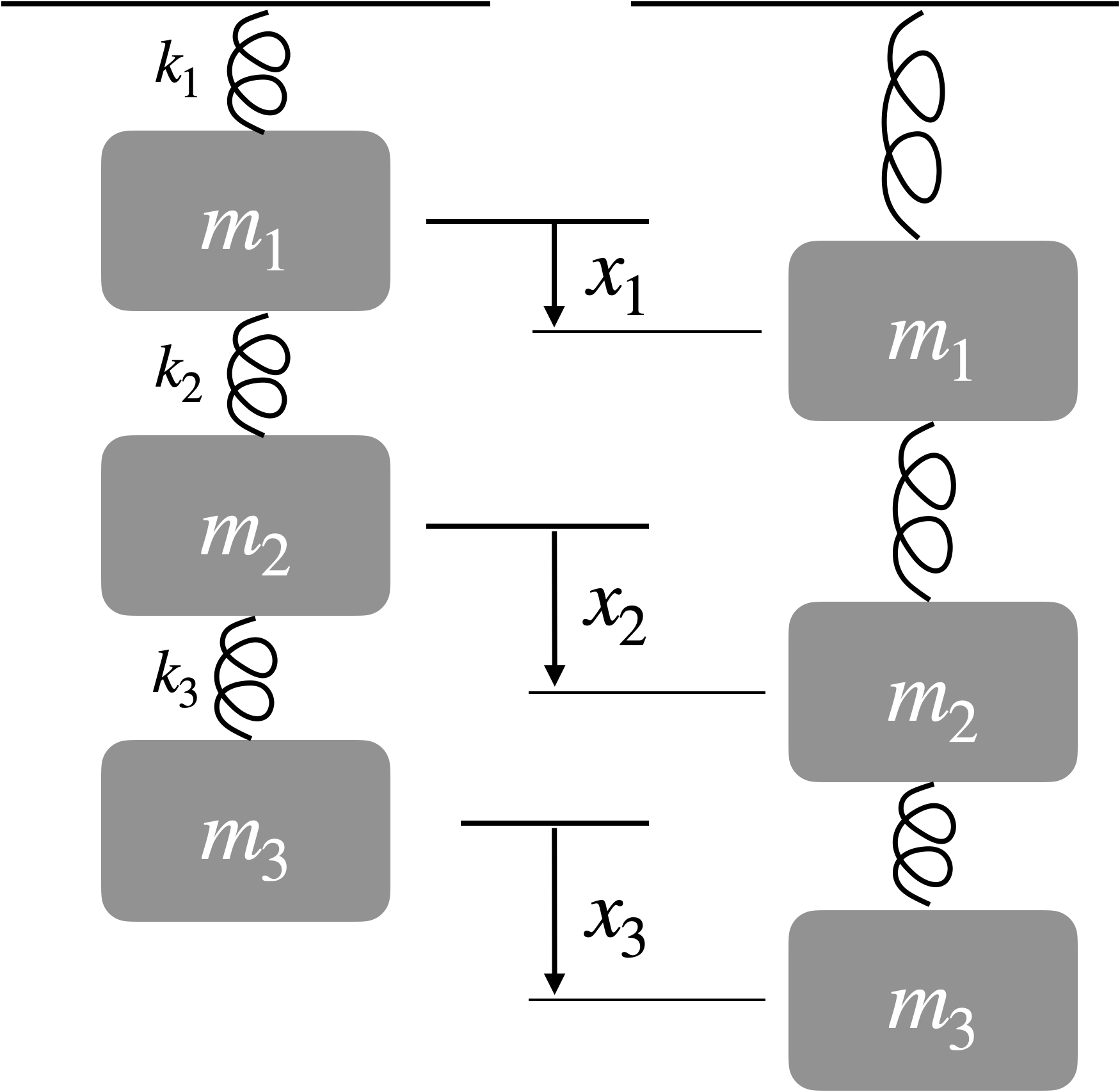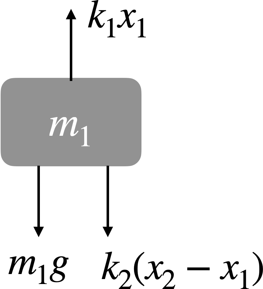 If \(m_1 = 5\) kg, \(m_2 = 3\) kg, \(m_3 = 2\) kg, and \(k_1 = k_3\) = 100 kg/s\(^2\) and \(k_2\) = 150 kg/s\(^2\), solve for the steady-state position of the springs (\(x_1, x_2, x_3\)). Note that these positions are relative to their initial positions when no spring force exists as shown in the figure. Recall that steady-state means each mass is in force equilibrium. I’ve drawn the free-body diagram for the first mass to get you started. Again be sure to use matrix form.
