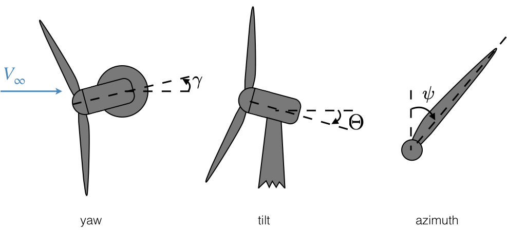 Vhub::Float64: freestream speed at hub (m/s)Omega::Float64: rotation speed (rad/s)pitch::Float64: pitch angle (rad)r::Float64: radial location where inflow is computed (m)precone::Float64: precone angle (rad)yaw::Float64: yaw angle (rad)tilt::Float64: tilt angle (rad)azimuth::Float64: azimuth angle to evaluate at (rad)hubHt::Float64: hub height (m) - used for shearshearExp::Float64: power law shear exponentrho::Float64: air density (kg/m^3)mu::Float64: air viscosity (Pa * s)asound::Float64: air speed of sound (m/s)