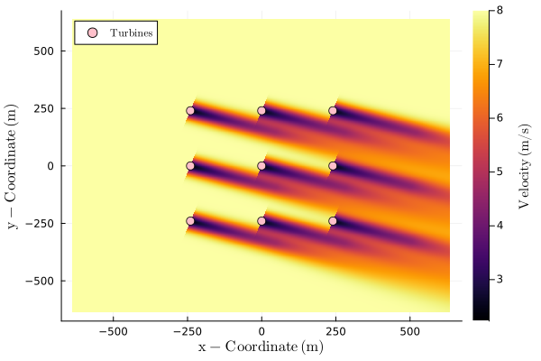 endNext, we can set up wake and related models. Here we will use the default values provided in FLOWFarm. However, it is important to use the correct model parameters. More information and references are provided in the doc strings attached to each model.