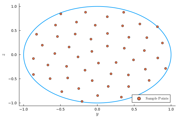 rotorsamplepointsy, rotorsamplepointsz = FLOWFarm.rotor_sample_points(nsamplepoints, method="sunflower")([-0.07410836062639709, 0.015218865228956489, 0.13673646546308013, -0.2618432050129595, 0.25440179343349323, -0.08653476830049676, -0.16701958726816815, 0.3656303187083795, -0.38303743548855274, 0.1856809233100207 … -0.4817598863166705, 0.8830705168069845, -0.8243825104580116, 0.32586882131681083, 0.3574932865011348, -0.8663755084100319, 0.9262022154807192, -0.49530244582727084, -0.20782082756188439, 0.8152470554454784], [0.06788932895734043, -0.1734111197246969, 0.17834850579052913, -0.046316376106210956, -0.16182959681996725, 0.321905024791926, -0.3215860519081978, 0.13352760597105143, 0.15811228520113338, -0.3967893479390924 … -0.765564647902427, 0.24201301768723907, 0.42305949349566085, -0.8789751930978891, 0.8781733593639224, -0.41059152161141643, -0.28555804214300595, 0.8451458139004672, -0.9677853498733453, 0.5791133210240265])The sunflower sampling method: